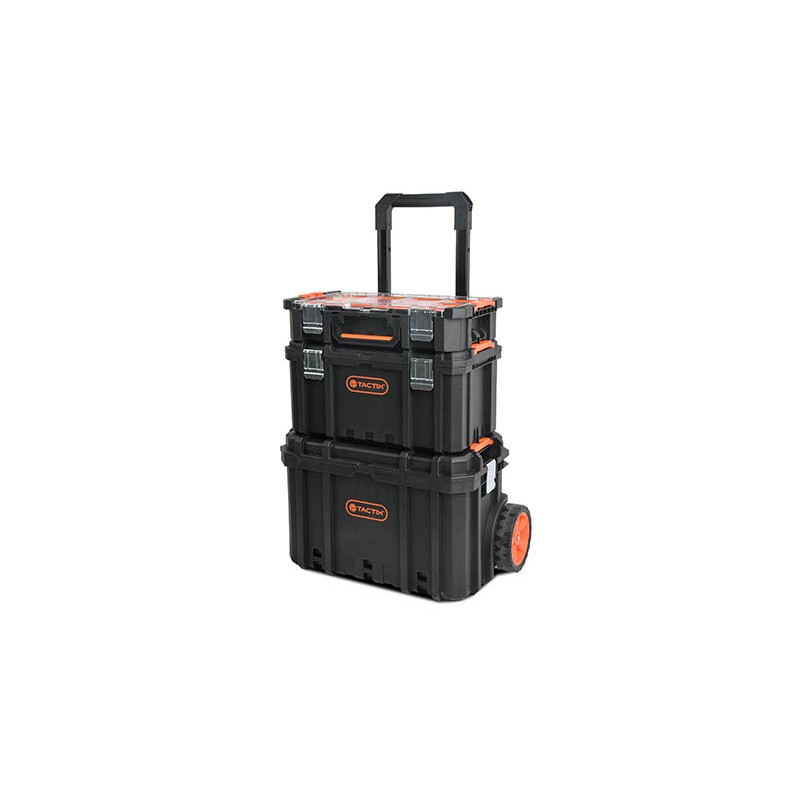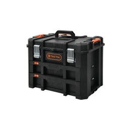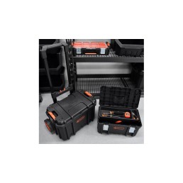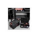 Orange PP tray inside 2 Side removable organizers 2 Heavy-duty steel latches Aluminum comfort-grip top handle 51 W x 23 D x 21 H cm